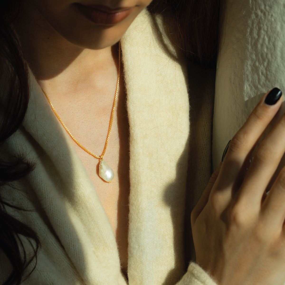 A natural baroque pearl, raw and radiant in its form. No two are alike. Each pendant carries its own rhythm of the sea, glowing with a soft, natural luster.