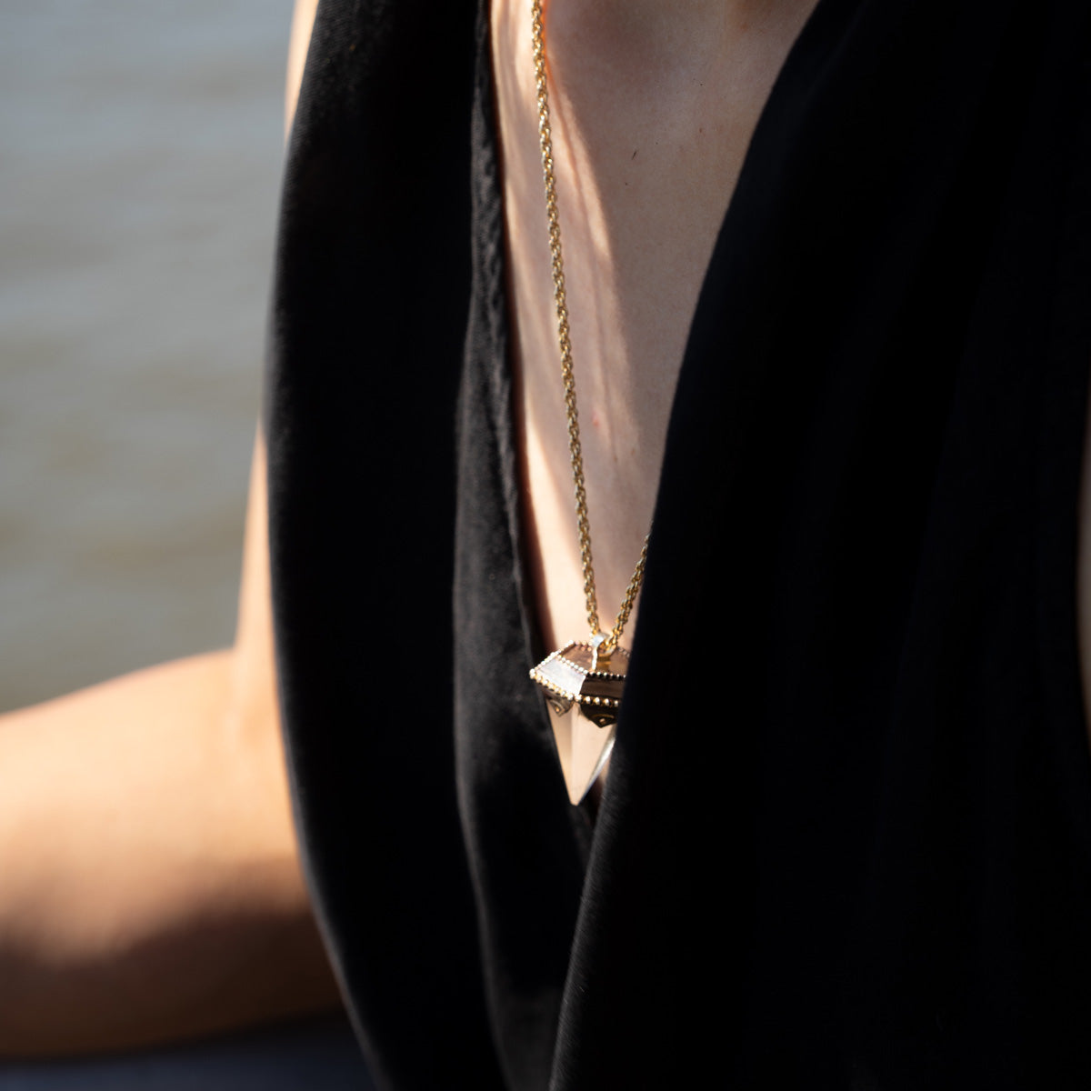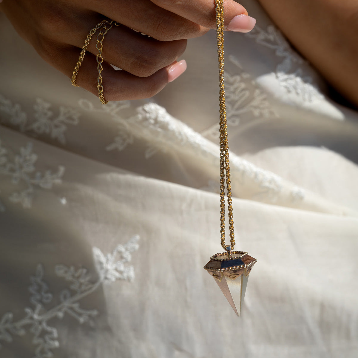Material: Crystal Pendant with 14k gold e-coated cap and antique stained chain